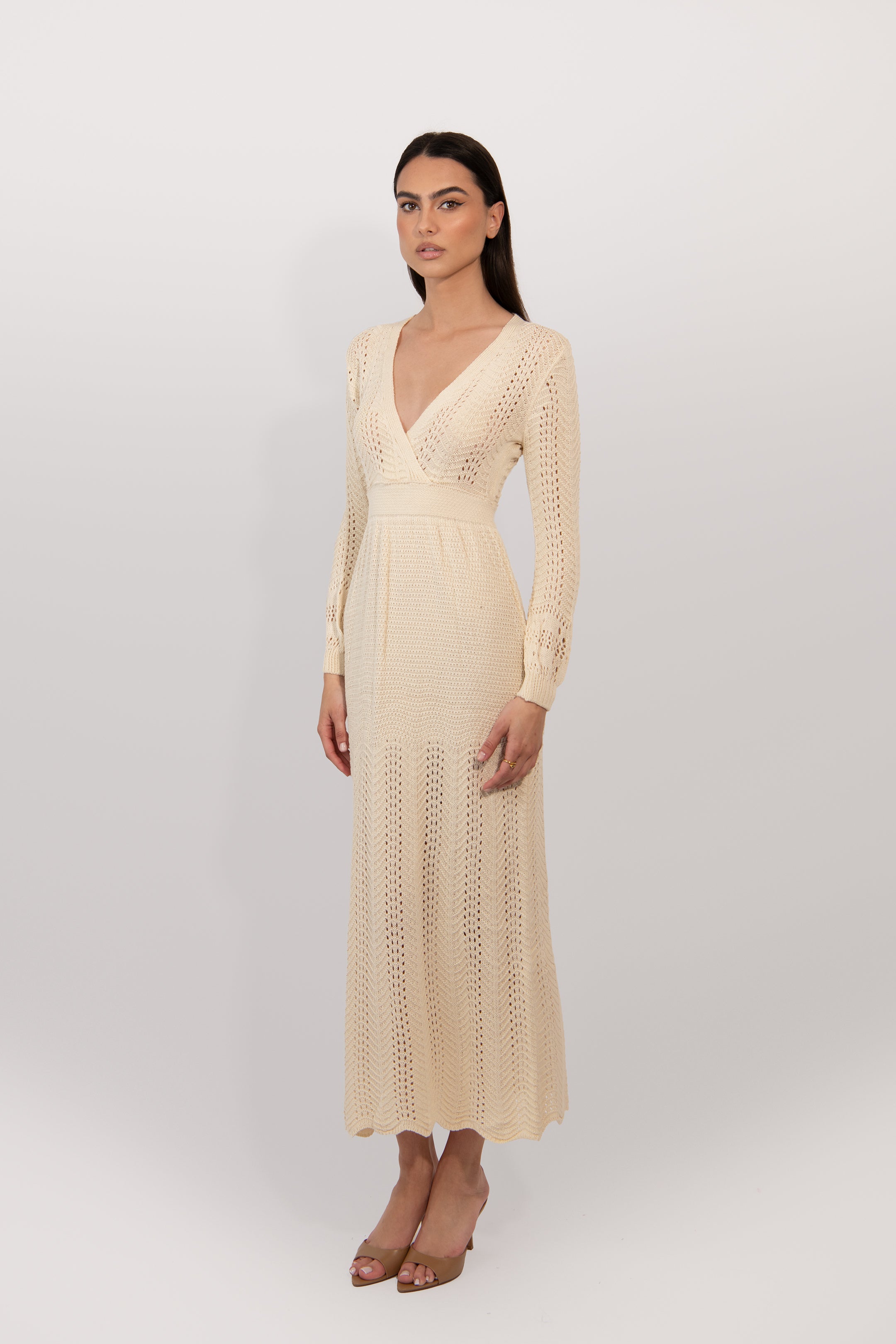 Pletena bijela haljina, izrađena od prozračnog pletiva, ova haljina savršeno prati liniju tijela i pruža udobnost