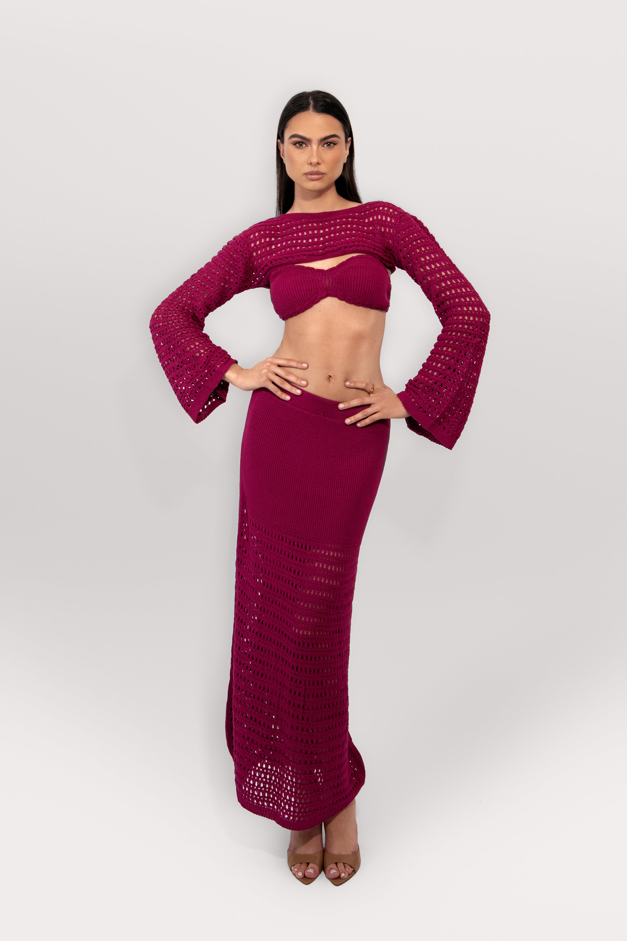 Pleteni trodijelni set (rukavi, top i suknja). Idealno za tople dane, ovaj ljetni komplet spaja udobnost i stil, savršen za plažu ili šetnju gradom.